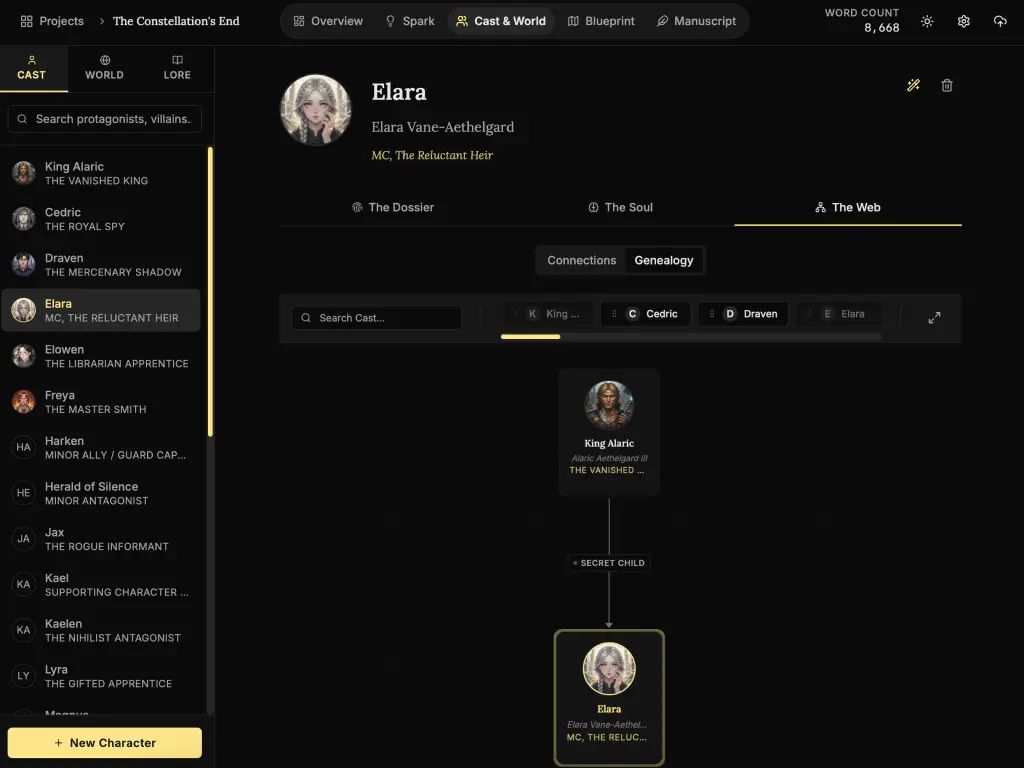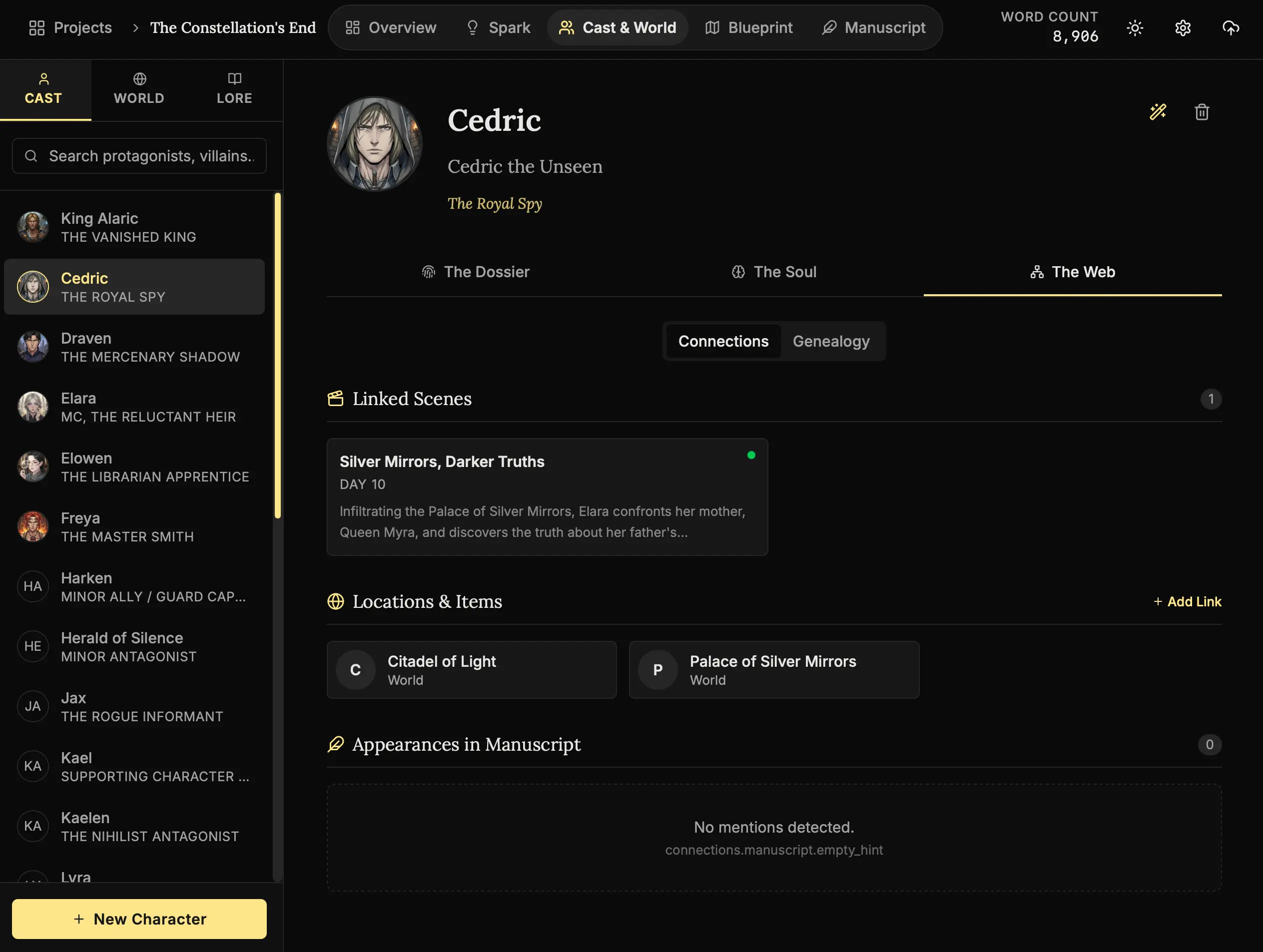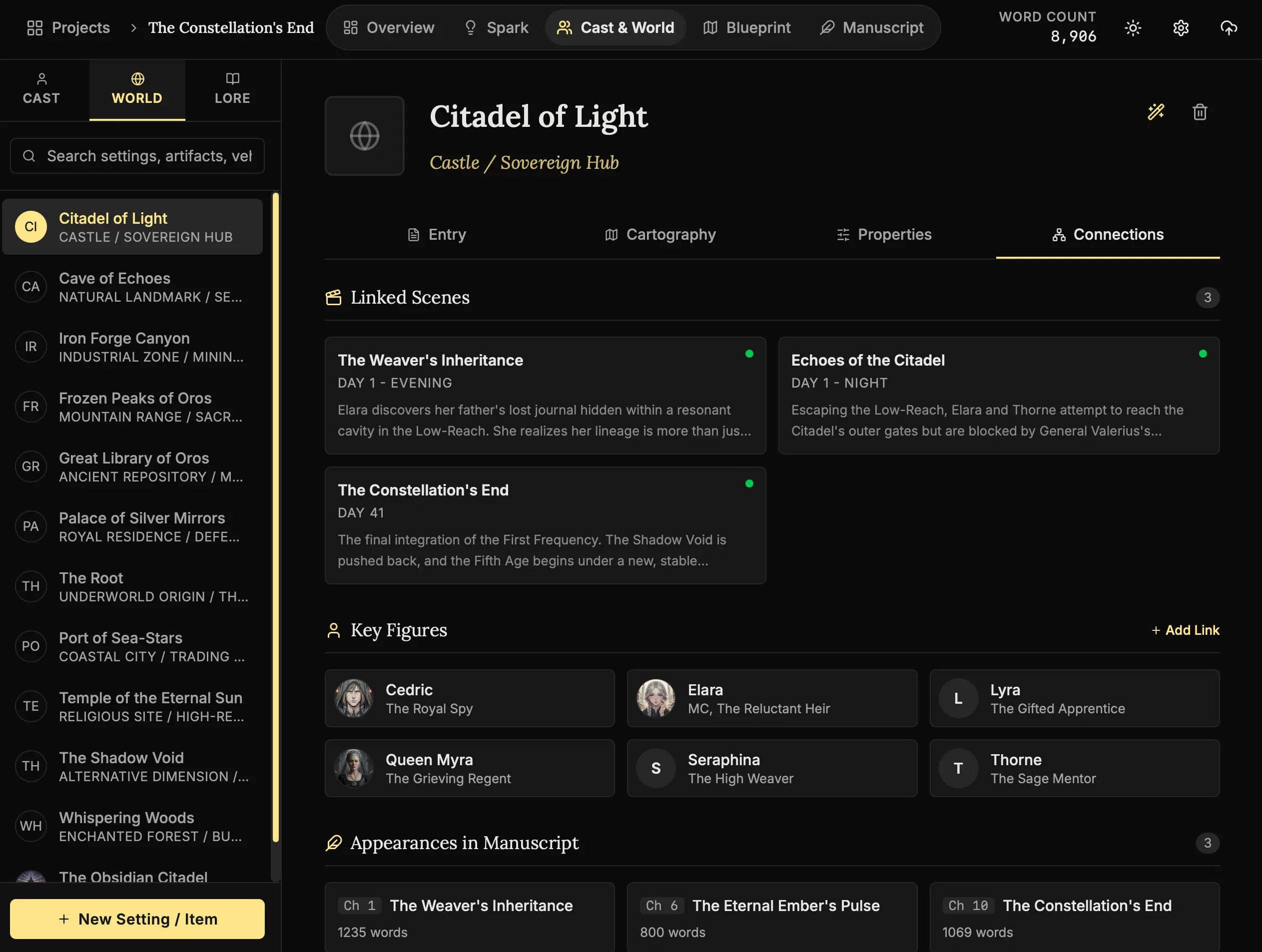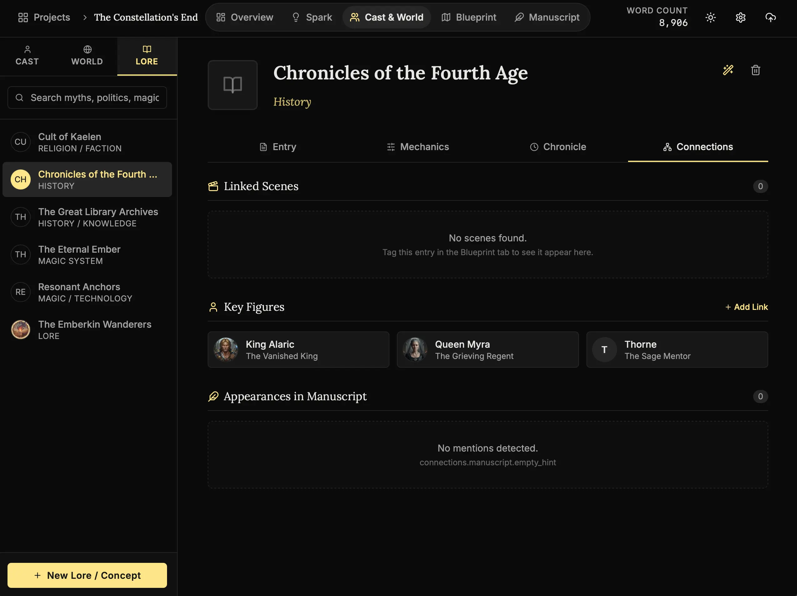In NovelOS, everything is connected. Link a character to a location, a location to a lore event, and a lore event to a specific scene in your book. Organize your story's complexity with a simple click.